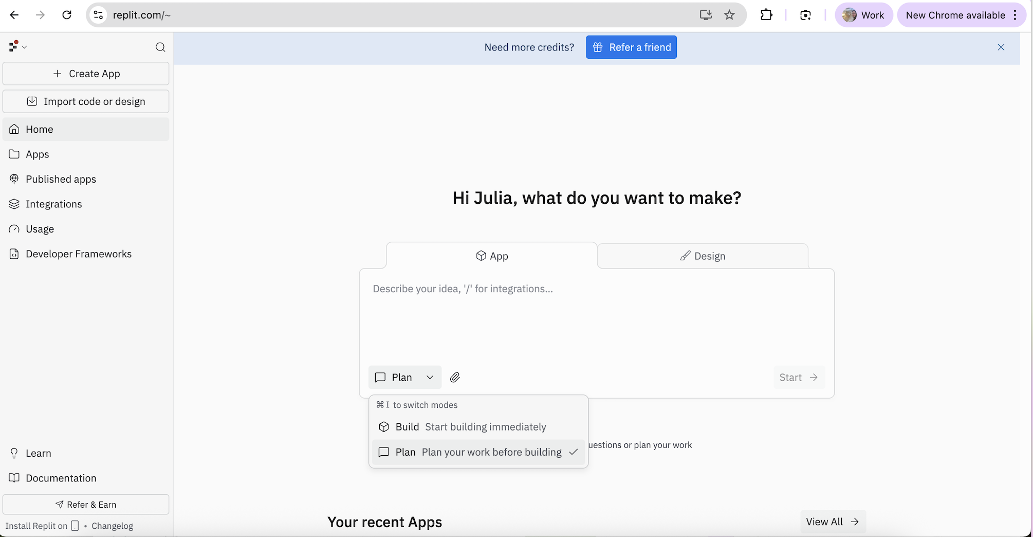 3. Choose "Plan," not "Build" — Give the Agent a moment to think it through first.