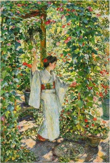 Torajirō Kojima „Ogród w Kioto” (1915) — kobieta zanurzona w świetle i letnich kwiatach, pełna subtelności i czułości.