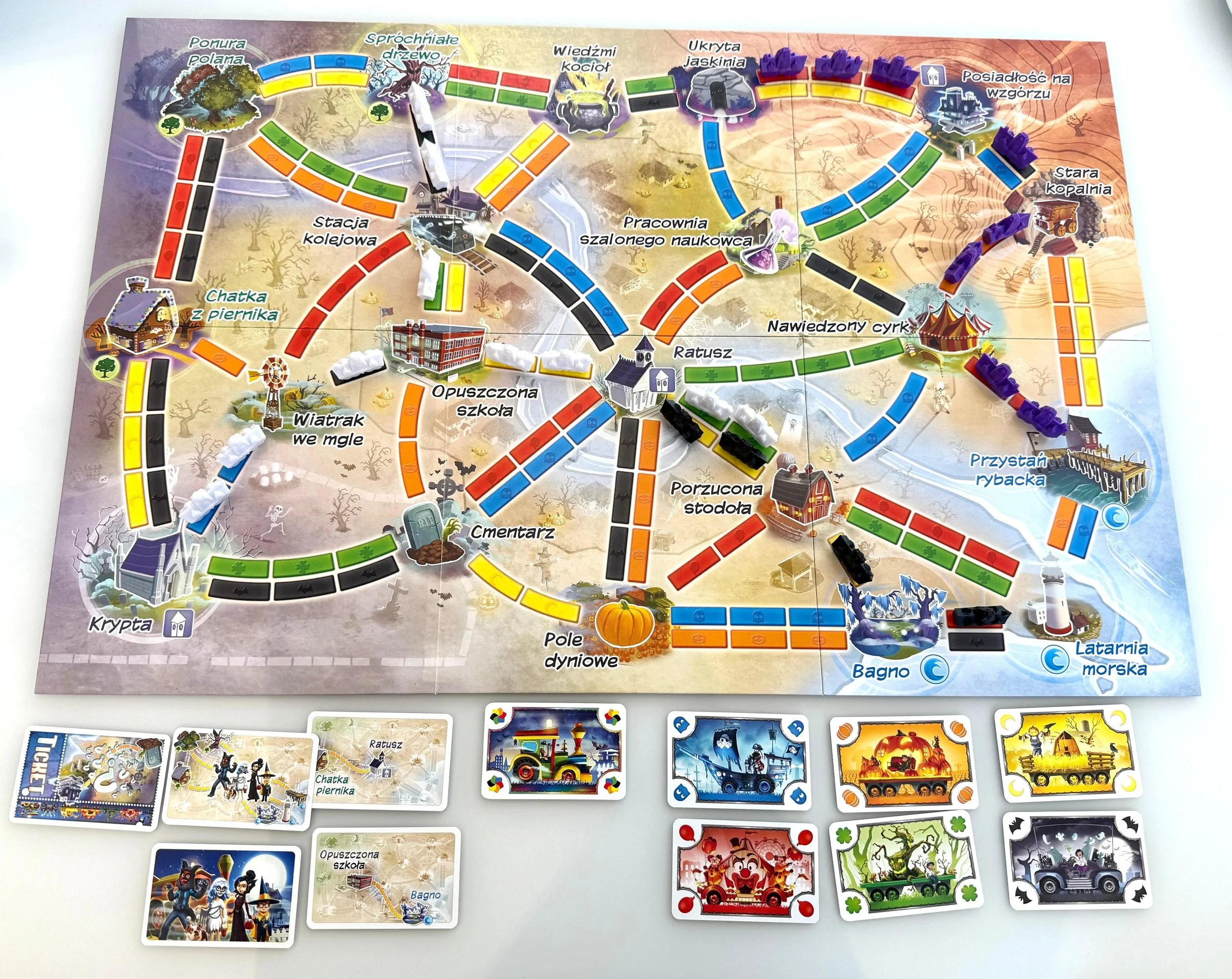 Each player becomes the conductor of a haunted train, trying to connect the locations shown on their tickets using 20 colorful carriages. At the start, you draw two tickets. The goal? Be the first to complete 6 tickets.