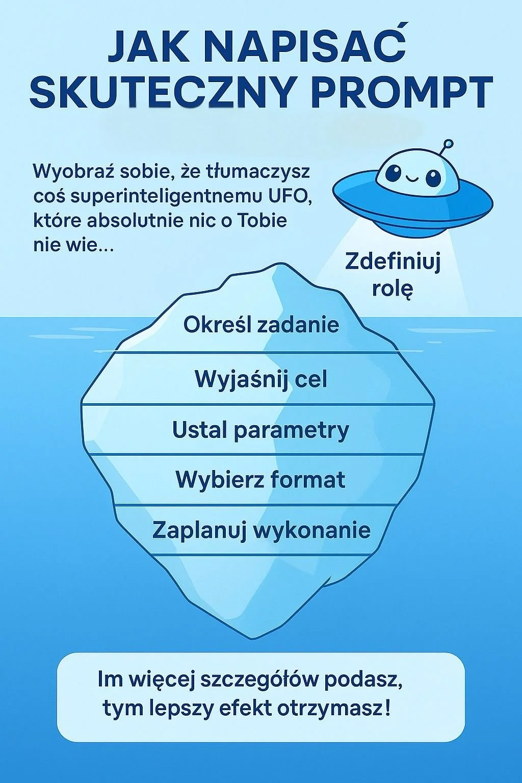 Pisanie promptu jest jak delegowanie zadania superinteligentnemu UFO, które właśnie wylądowało na Ziemi. To UFO potrafi niemal wszystko — planować, tworzyć, wyjaśniać, projektować — ale jest pewien haczyk: ono nic o Tobie nie wie. Nie zna Twoich preferencji, ani nawet tego, jak działa Ziemia.