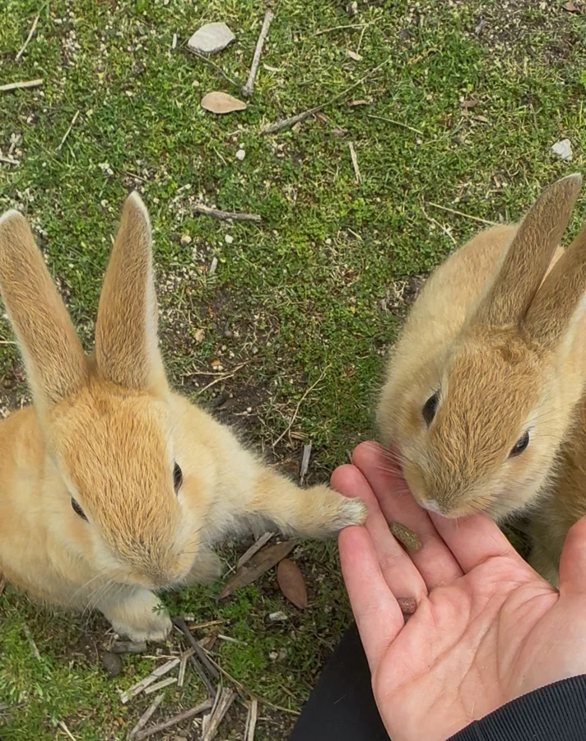 Bring pellets from the shop or fresh vegetables (carrots, cabbage) from elsewhere. The bunnies will love you for it. Avoid bread, sweets, or processed food — these can make them sick.