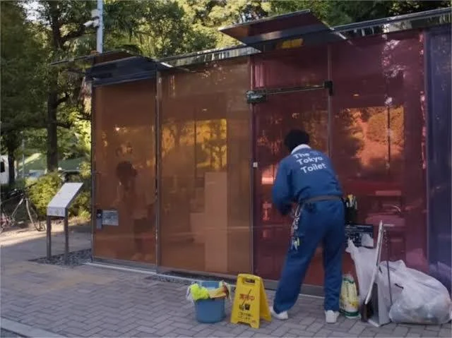 When I reached my last stop — just like in Perfect Days — a public toilet cleaner was there, methodically wiping handles, polishing mirrors, and watering plants.